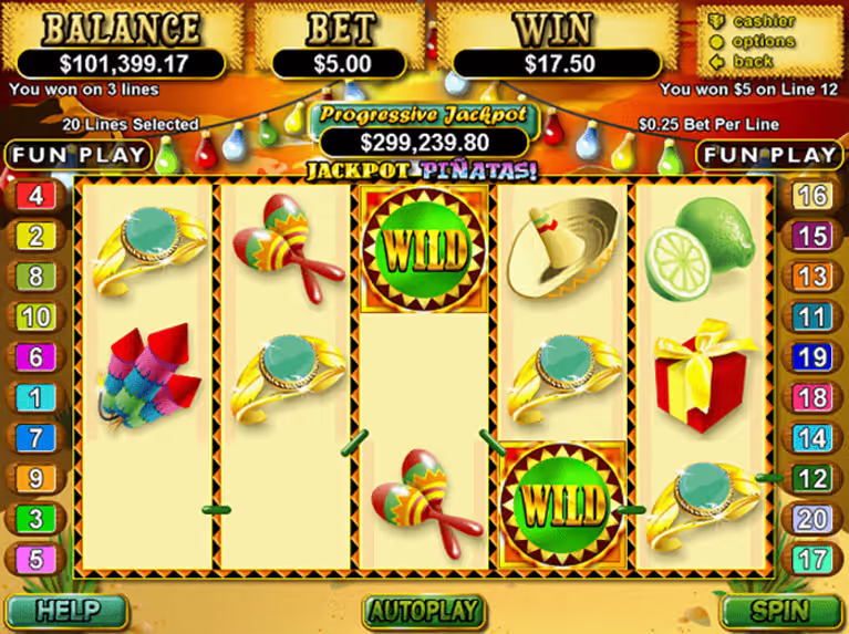 Jackpot Pinata is an exhilarating slot machine game with three symbols on each reel. Like other online slots out there. With 20 winning paylines in this game each line comes at a cost of $0.25. This means that every spin will amount to $5 in total. Keep in mind that the number of rows or the value of each line may vary based on preferences. But thats understandable considering the enormous jackpot prize awaiting lucky winners.